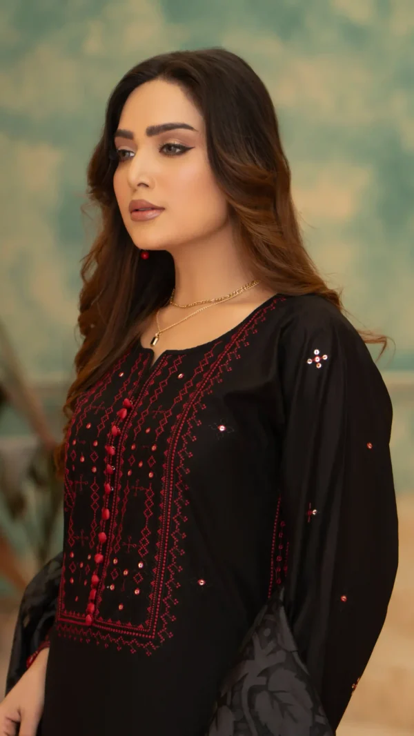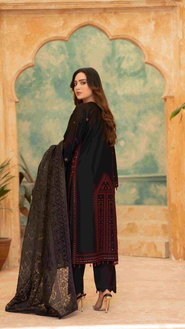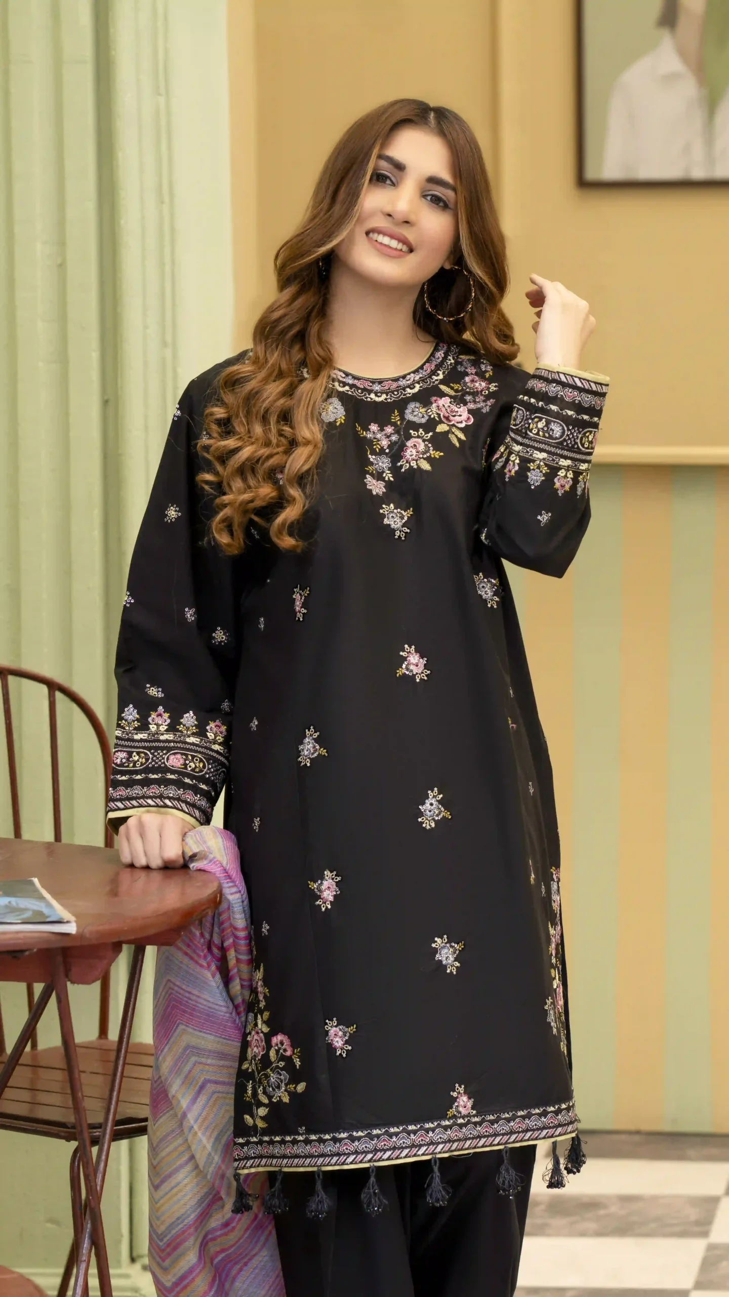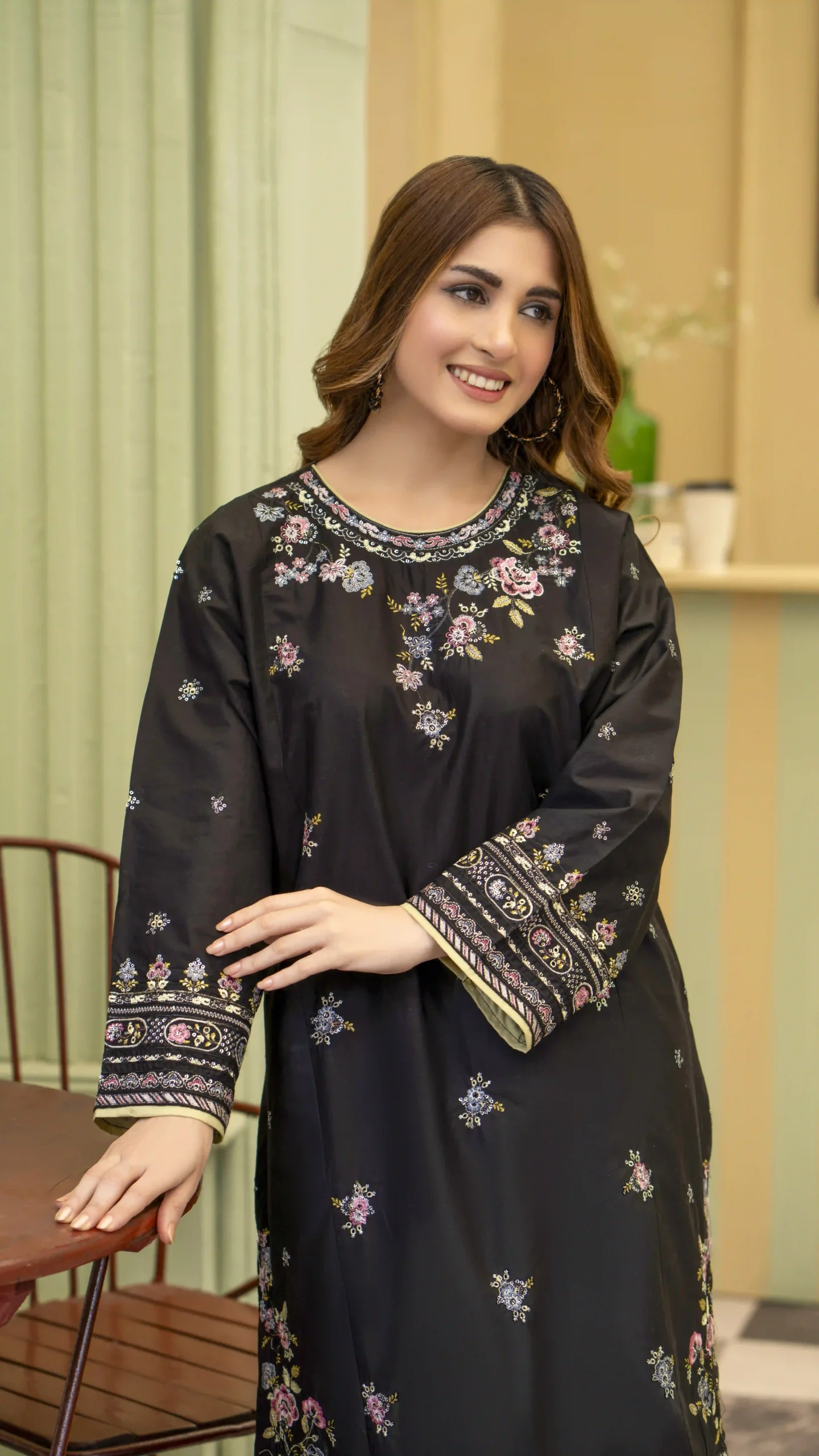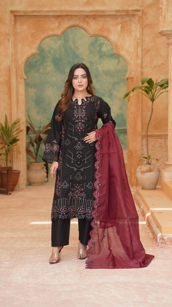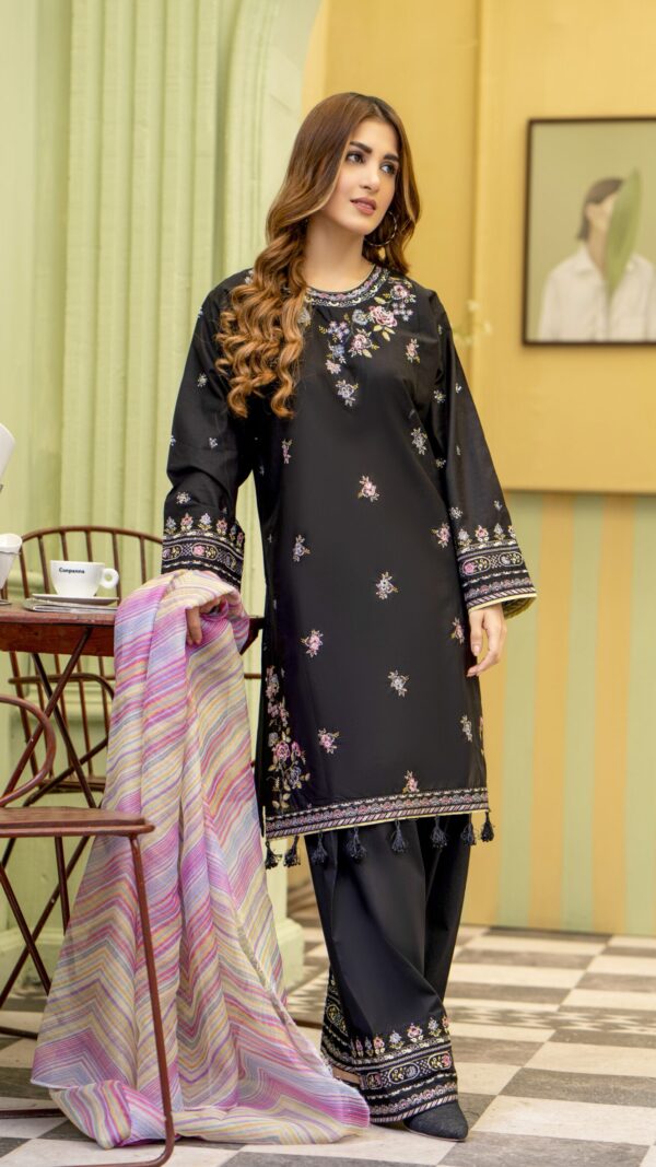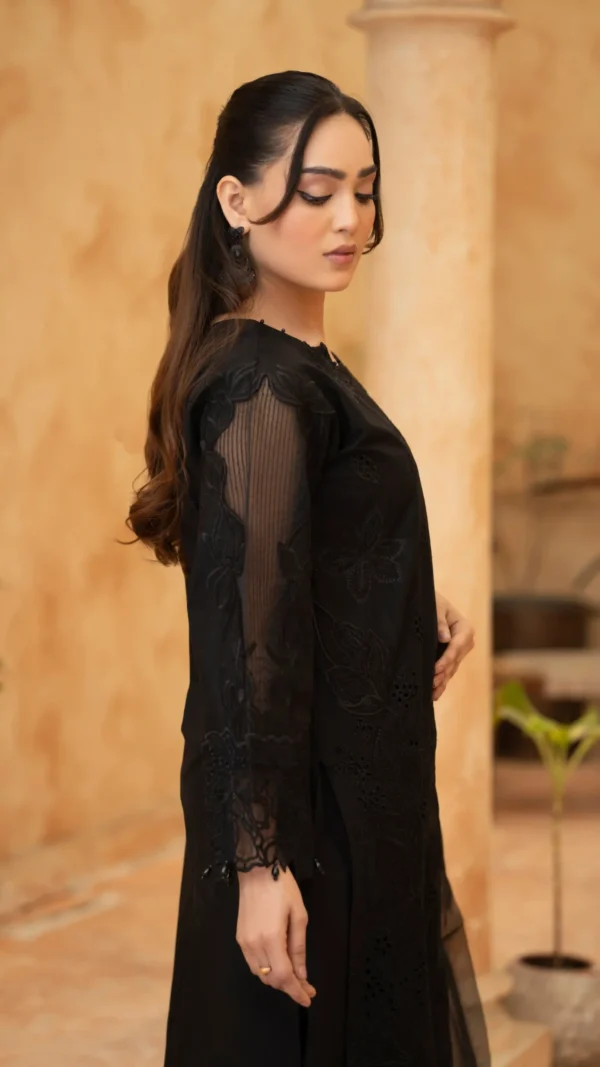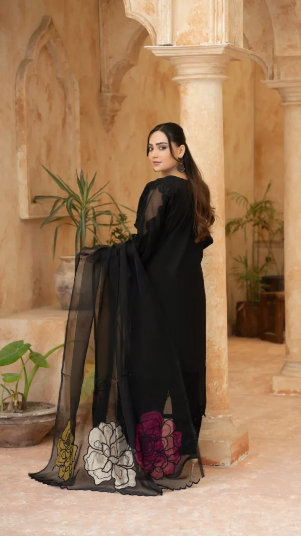 Elegant Black Embroidered Lawn Outfit with Floral Organza Dupatta