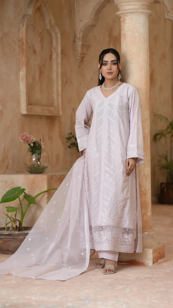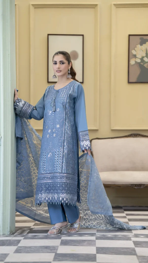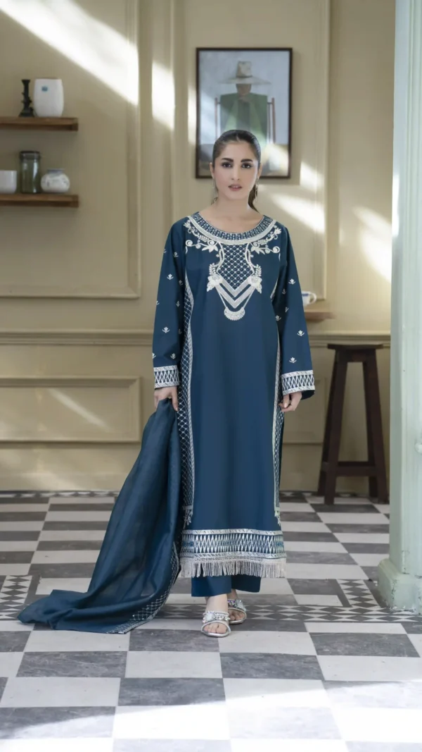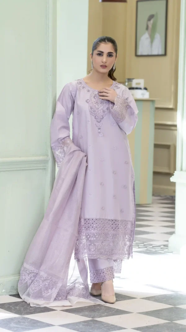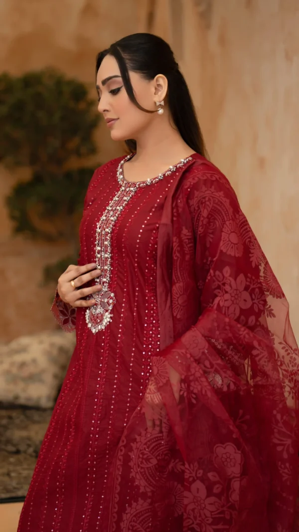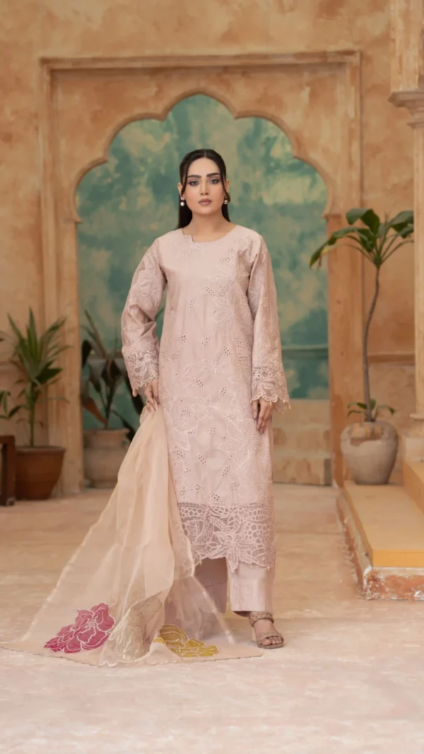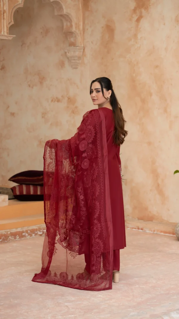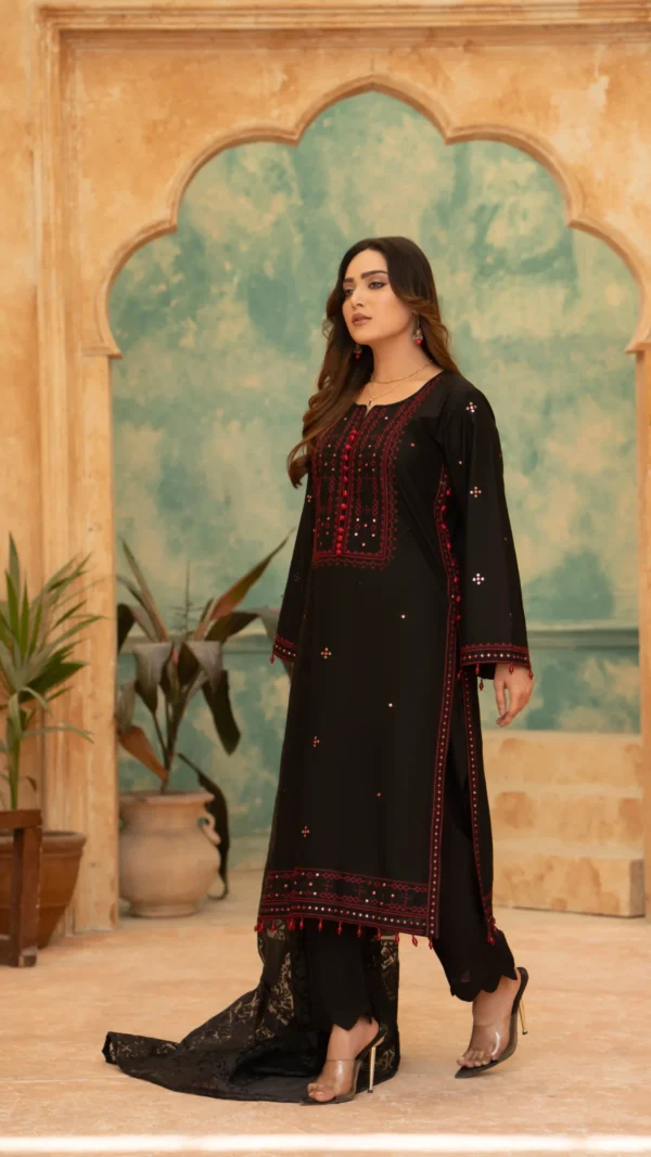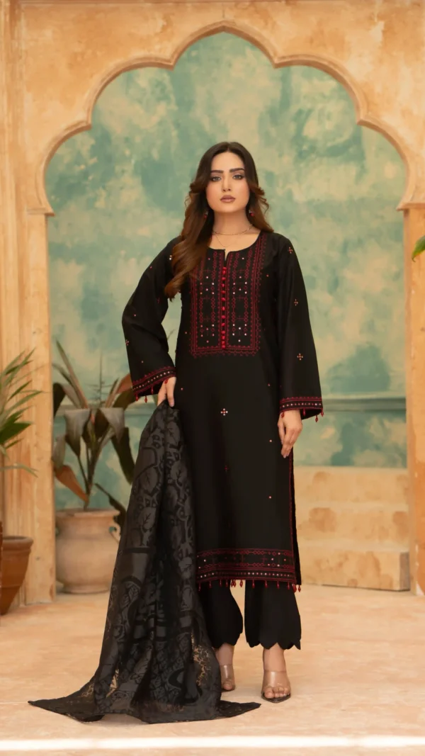Elegant Black Embroidered Lawn Outfit with Floral Organza Dupatta