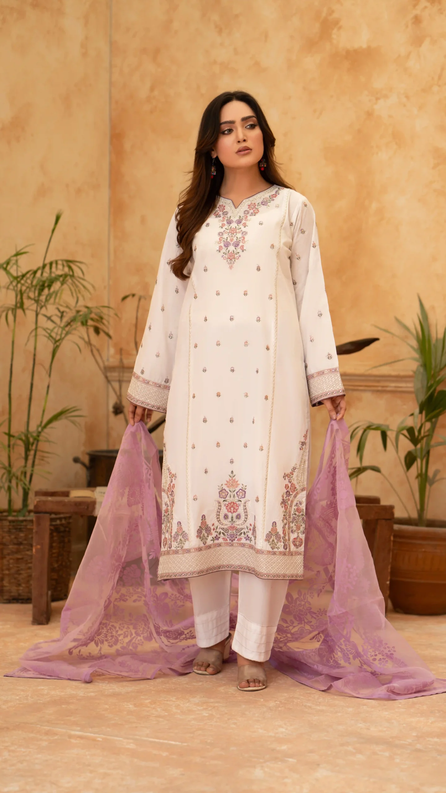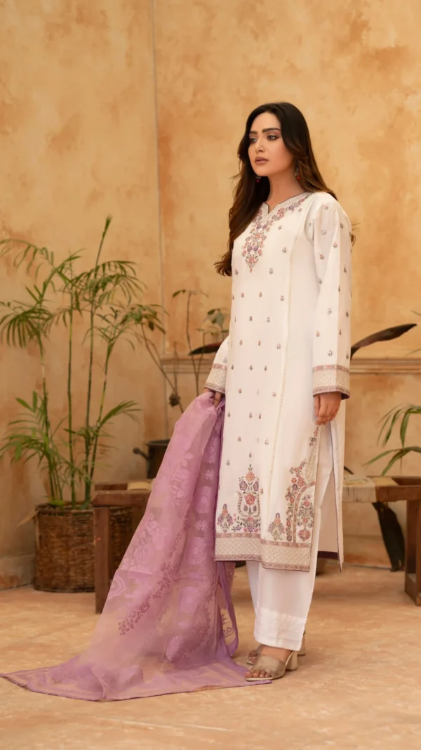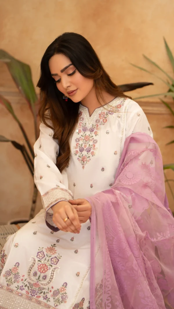 Design: White Shirt  showcases intricate pink and purple floral embroidery 🌸 on the neckline, sleeves, and lower hem, adding refined elegance. The outfit includes matching white trousers with subtle detailing. It is complemented by a sheer lilac organza dupatta 🧣 adorned with a graceful floral jacquard pattern, enhancing the ensemble’s sophisticated charm.