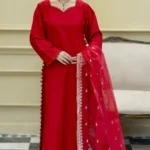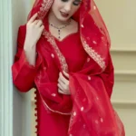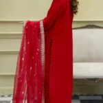 Chic red embroidered kurta set with a sheer embellished dupatta—perfect for elegant festive and formal wear.