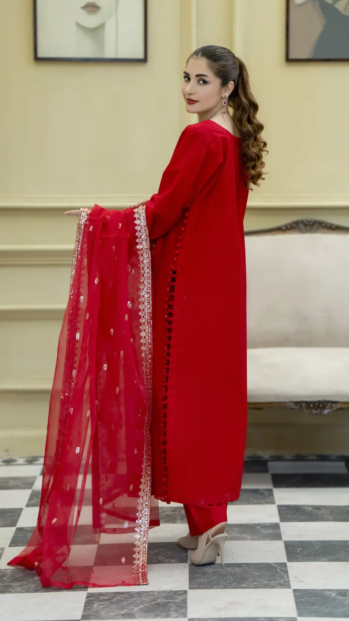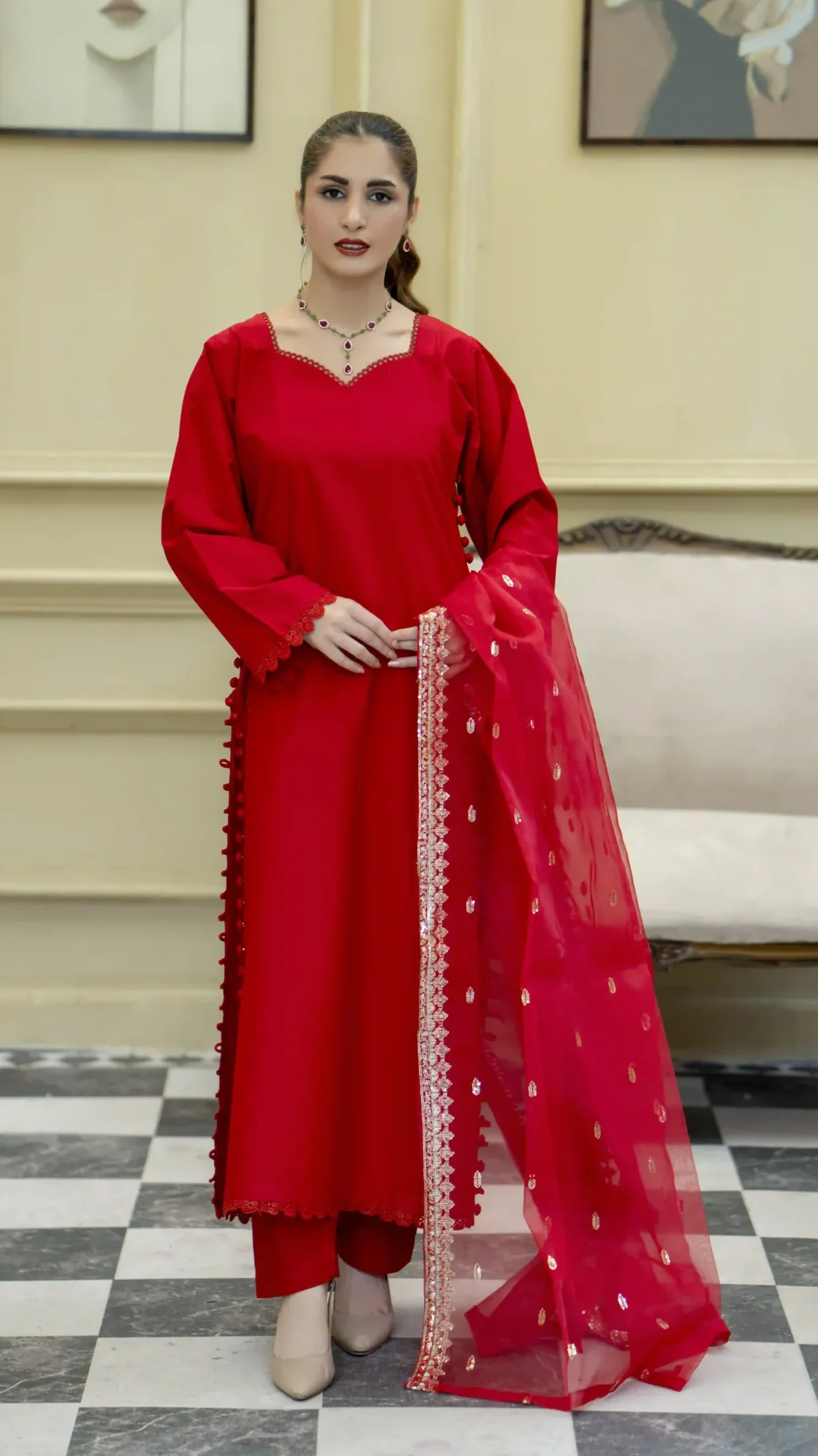 Chic red embroidered kurta set with a sheer embellished dupatta—perfect for elegant festive and formal wear.