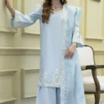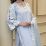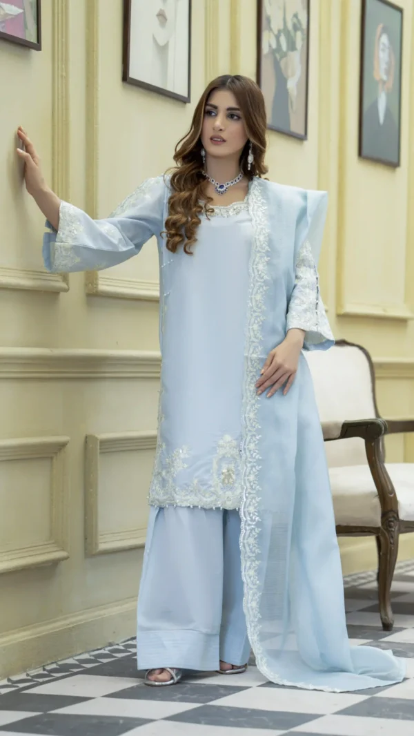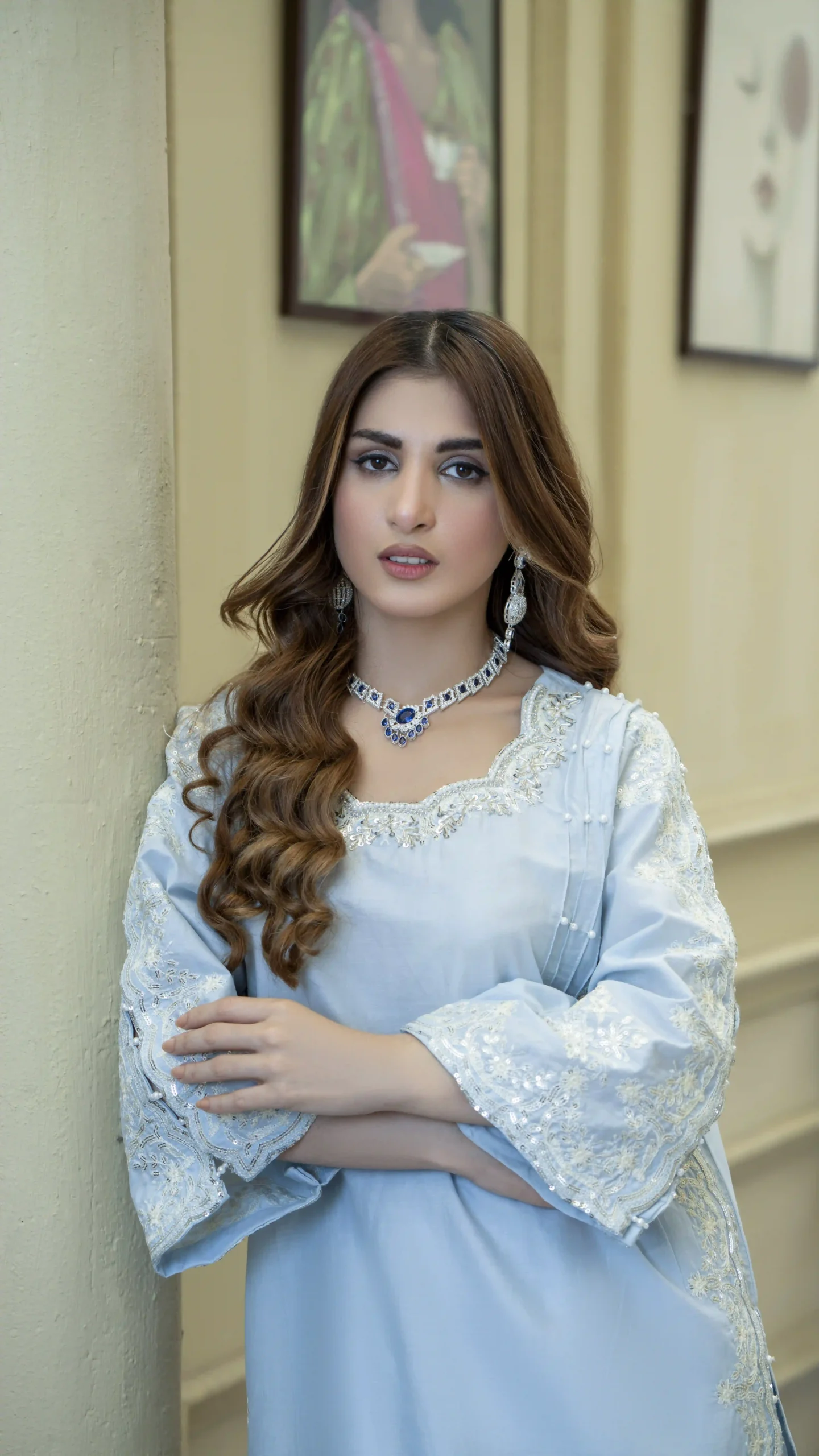 Elegant powder blue embroidered kurta set with a sheer dupatta, perfect for festive and formal wear.