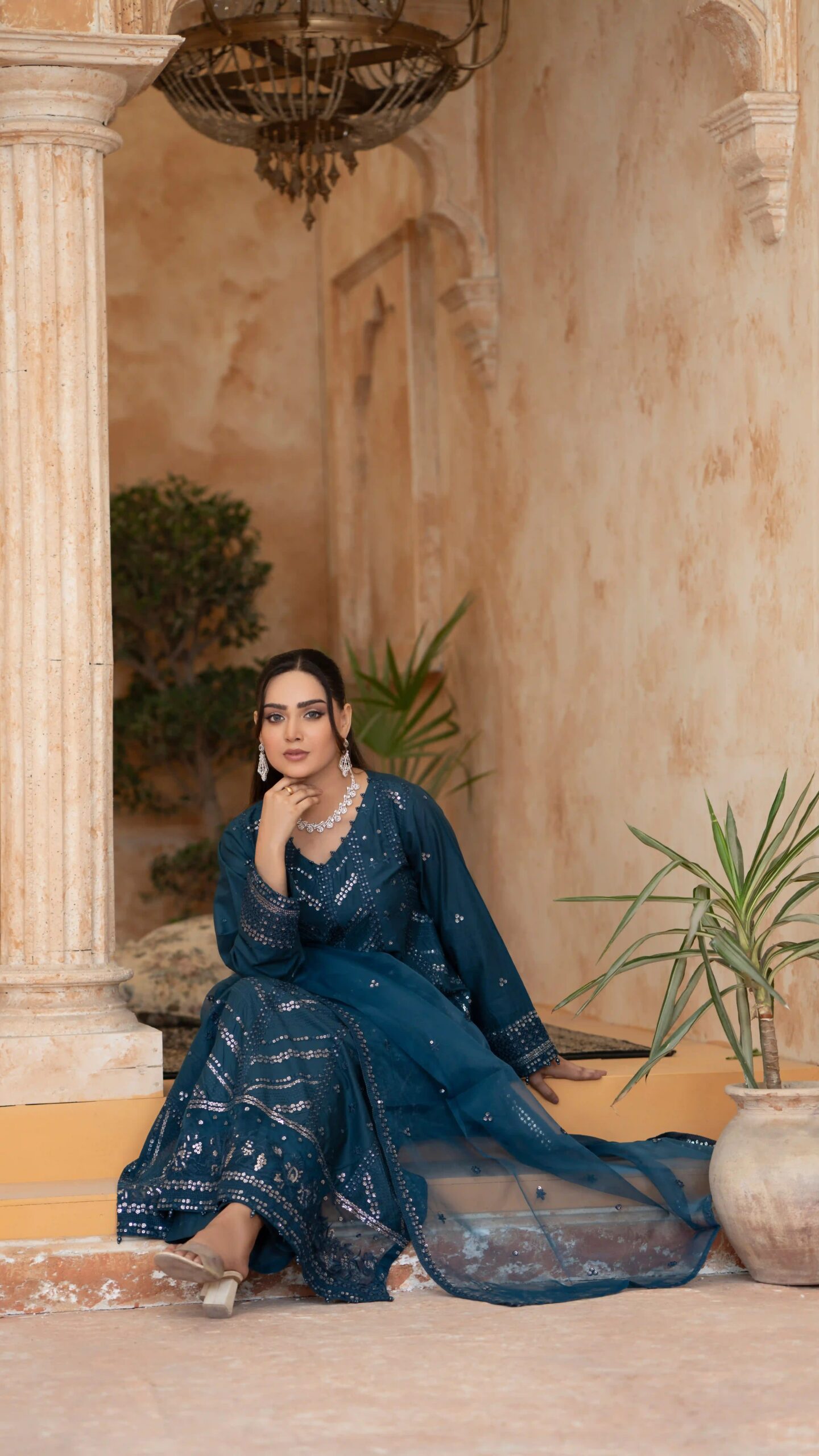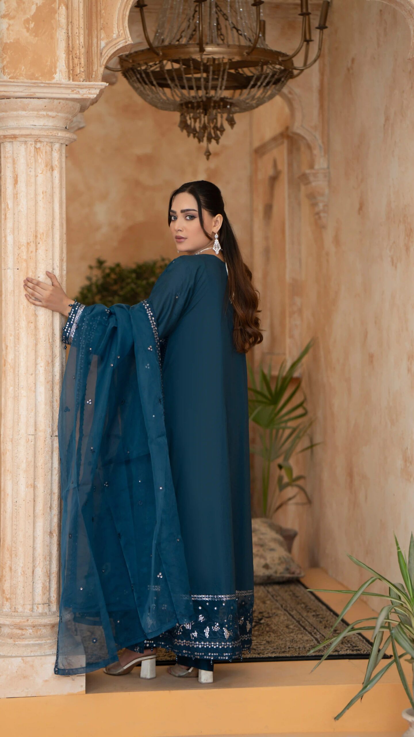Teal Sequined Embroidery outfit with Organza Dupatta & Trouser