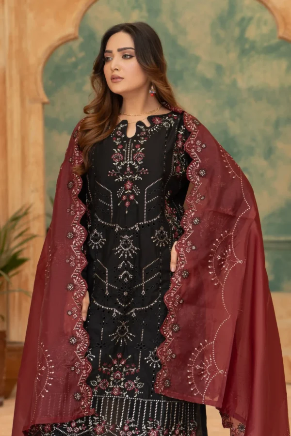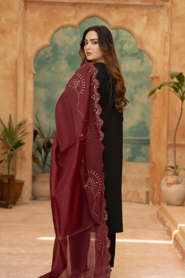 Embroidered Black Outfit with Maroon Organza Dupatta