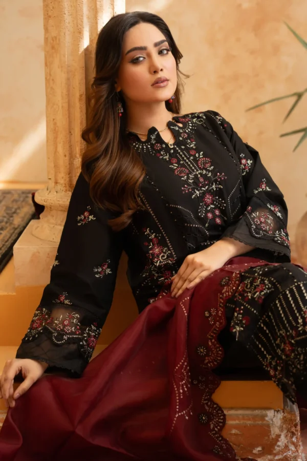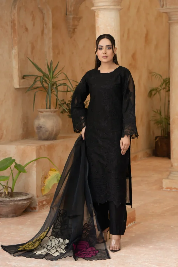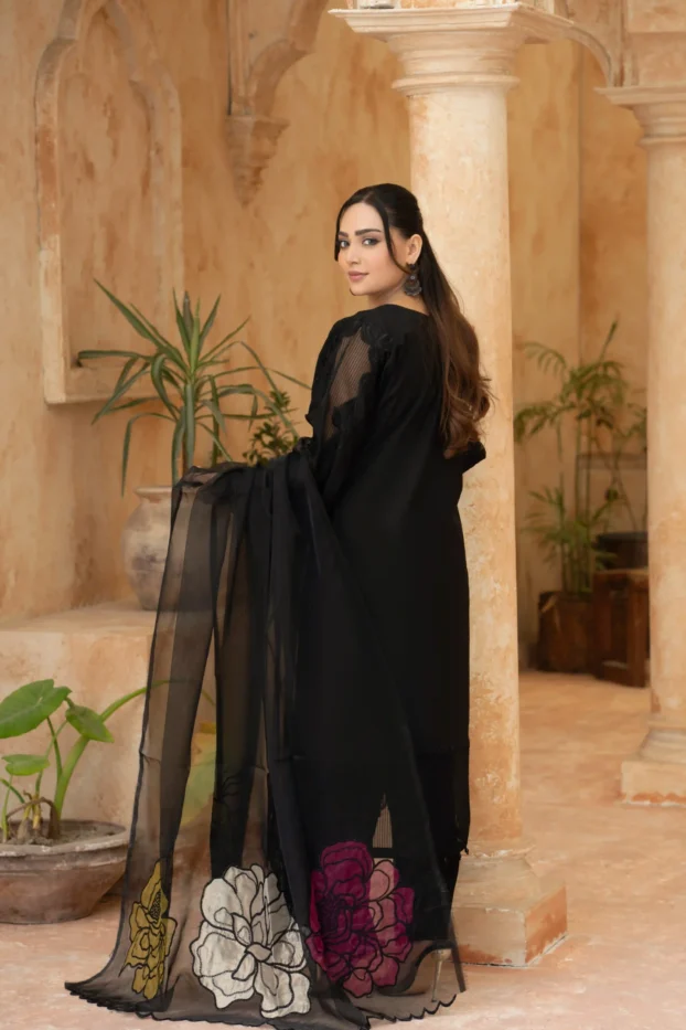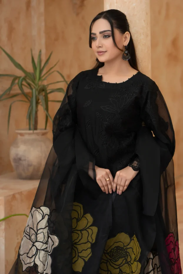 Elegant Black Embroidered Lawn Outfit with Floral Organza Dupatta
