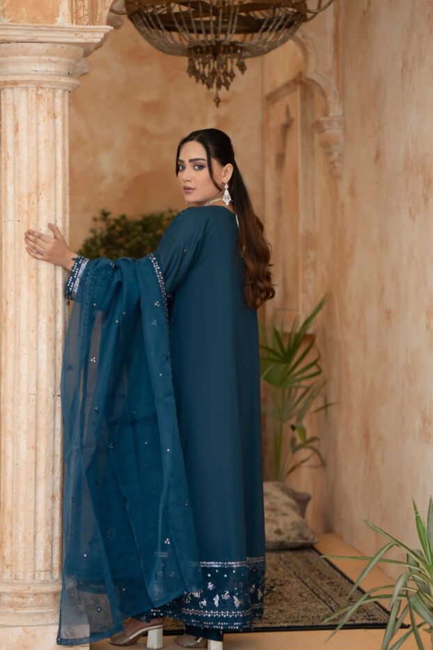 Teal Sequined Embroidery outfit with Organza Dupatta & Trouser